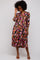 A floral print satin midi dress featuring a ruffle neckline with a keyhole and an adjustable tie, an empire waist, 3/4 length sleeves and side pockets.