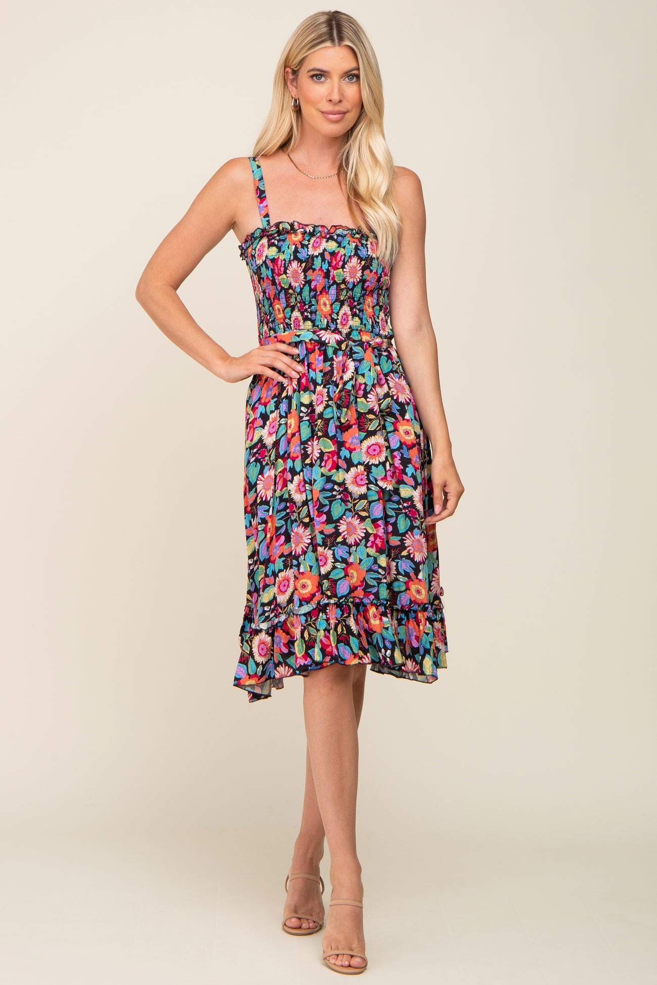 A floral sleeveless dress featuring adjustable shoulder straps, a smocked top, a self-tie waist, a ruffle hem and a ruffle neckline.