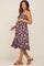 A floral sleeveless maternity dress featuring adjustable shoulder straps, a smocked top, a self-tie waist, a ruffle hem and a ruffle neckline.