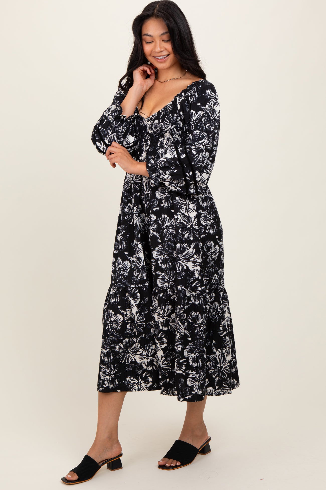 Black Floral Smocked 3/4 Sleeve Tiered Midi Dress