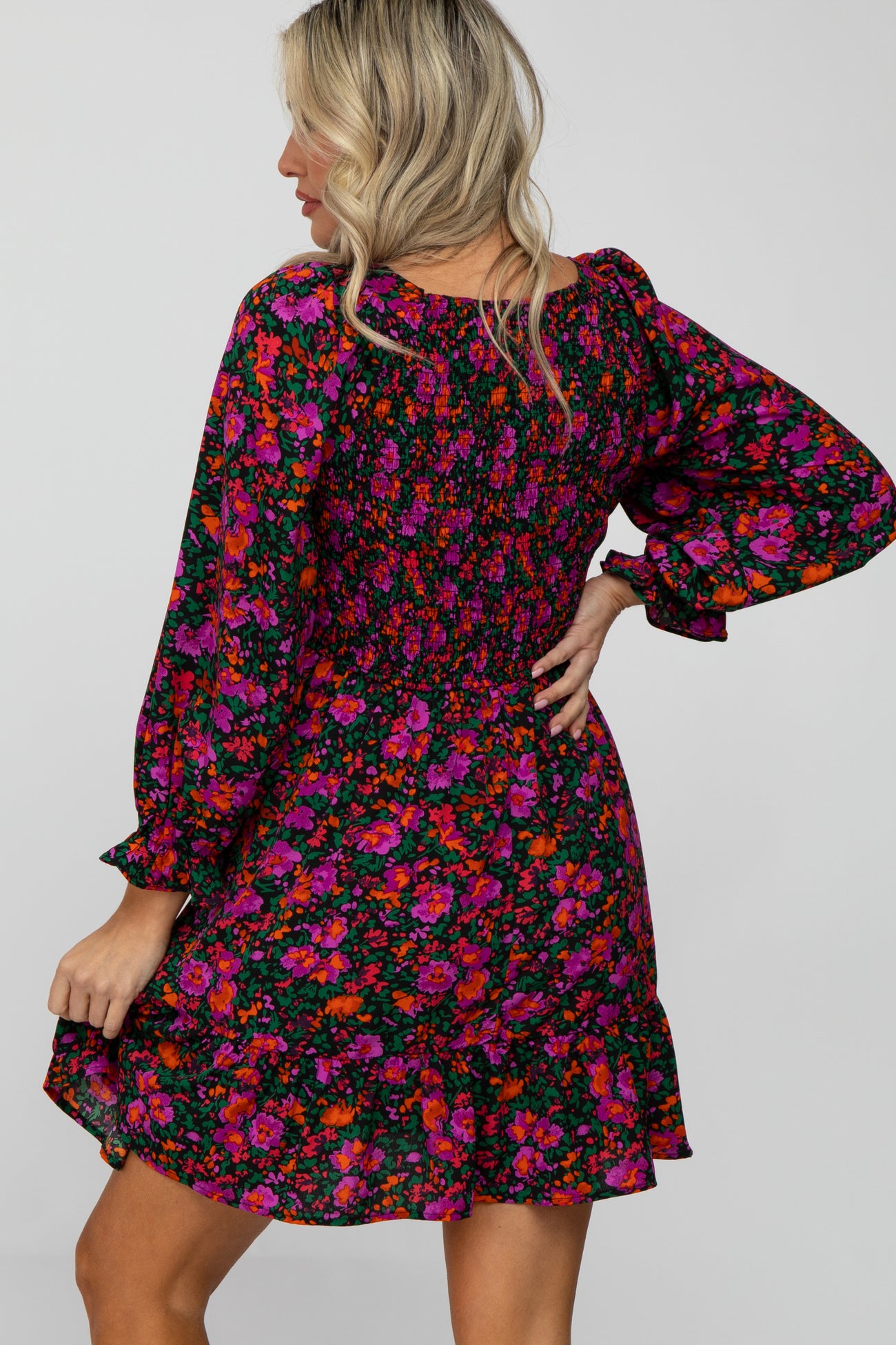 A floral print maternity dress featuring a v-neckline, long sleeves with a ruffle cuff, a smocked elastic front and a ruffle hem.
