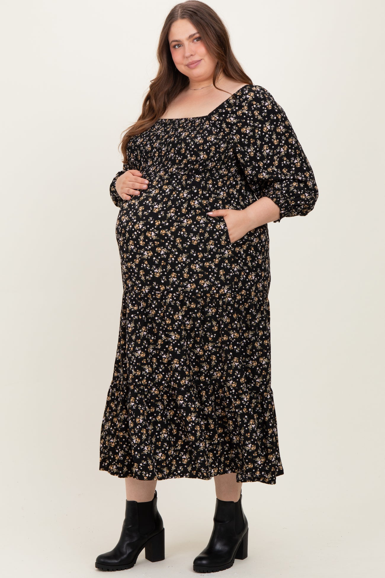 Embrace comfort and style with our Black Floral Smocked Long Sleeve Maternity Plus Maxi Dress. Designed to flatter your growing bump, this dress features a stretchy smocked bodice and a square neckline for a chic, feminine look. The delicate floral pattern on a black background adds a touch of elegance, while the long puff sleeves with gathered cuffs provide cozy coverage. The flowing maxi length ensures ease of movement and all-day comfort. Perfect for casual outings or special occasions, this dress is a must-have addition to your maternity wardrobe. Pair it with ankle boots or flats for a stylish, effortless look.