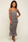 A floral midi dress with a straight neckline, adjustable straps, a smocked body, and ruffle accent tiers.