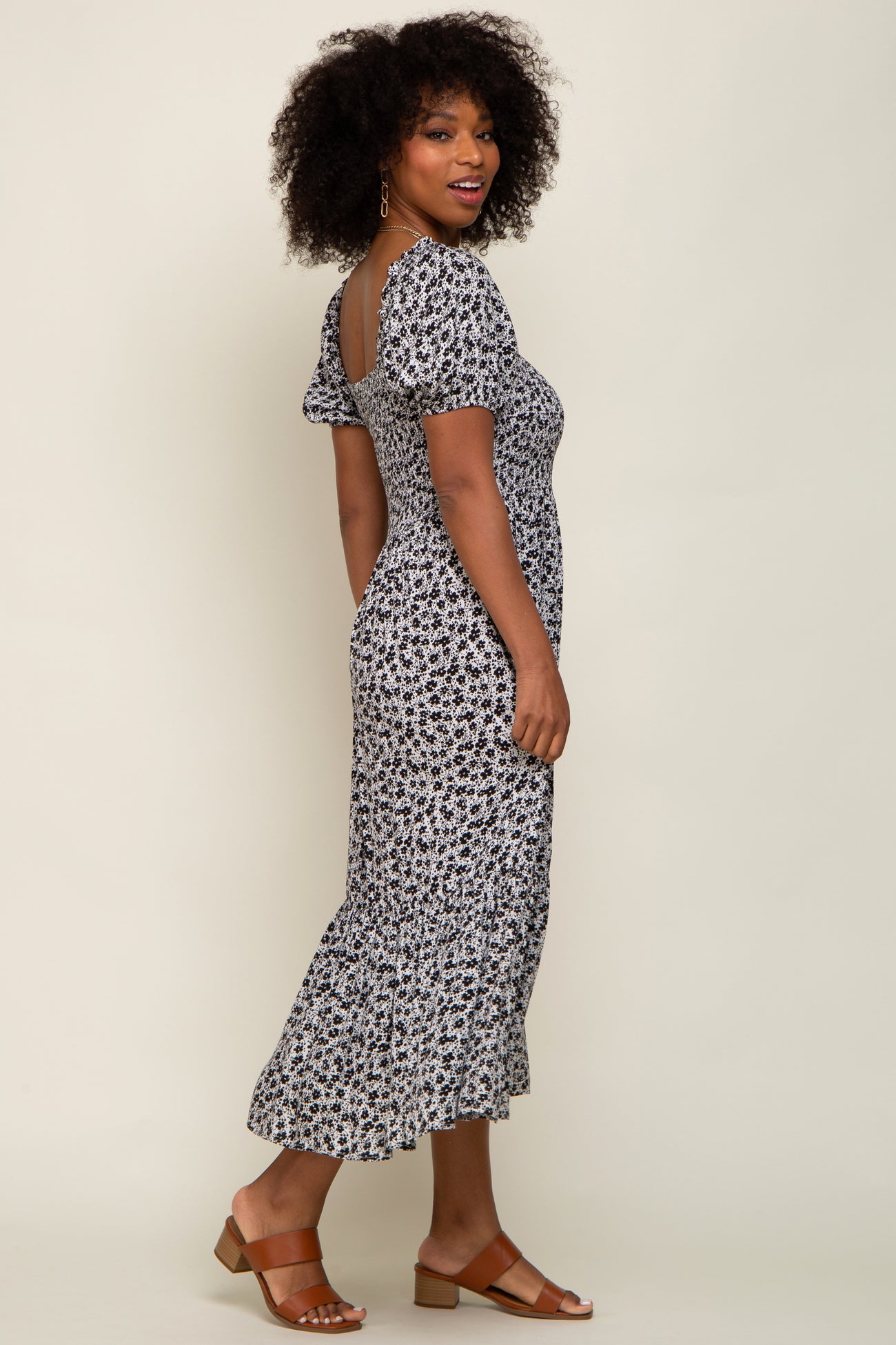 A floral print midi dress featuring a square neckline with ruffle trim at the shoulder, short puff sleeves, a smocked elastic top, side pockets and a ruffle hem.