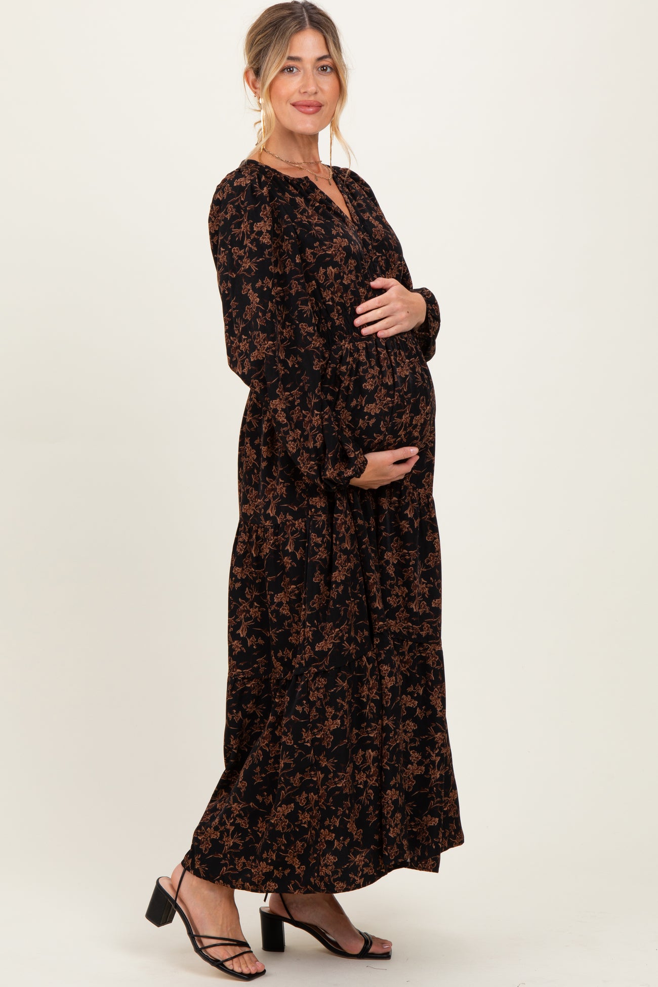 Black Floral Smocked Waist Long Sleeve Maternity Midi Dress