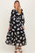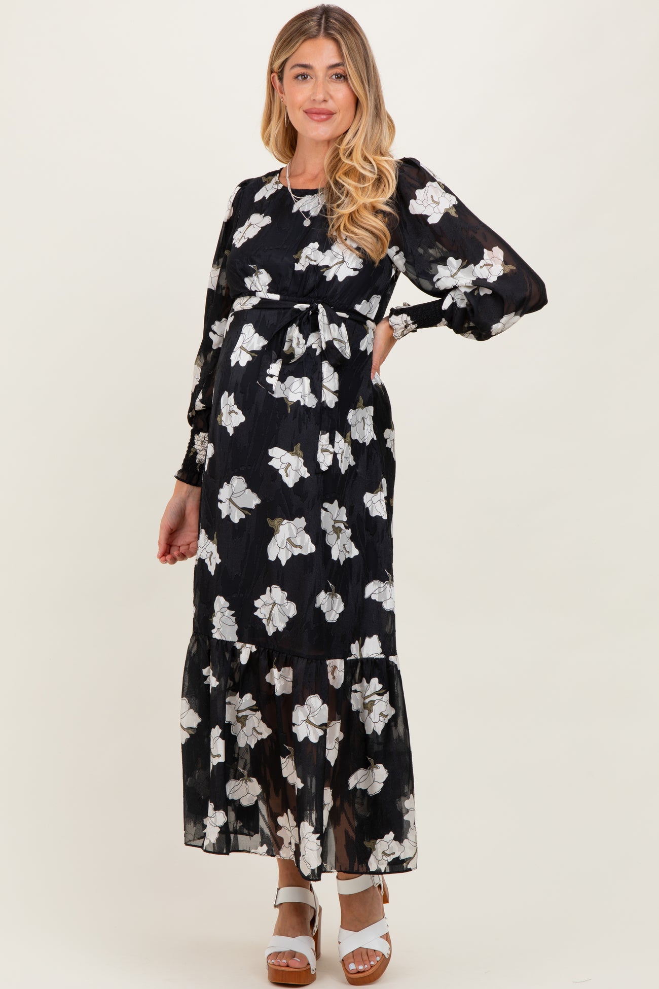 Black Floral Textured Bubble Sleeve Maternity Midi Dress