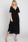 A solid hued midi dress featuring a v-neckline with an adjustable front tie, a front cutout, short ruffle sleeves, a smocked elastic back, an empire waist and an A-line double lined skirt.
