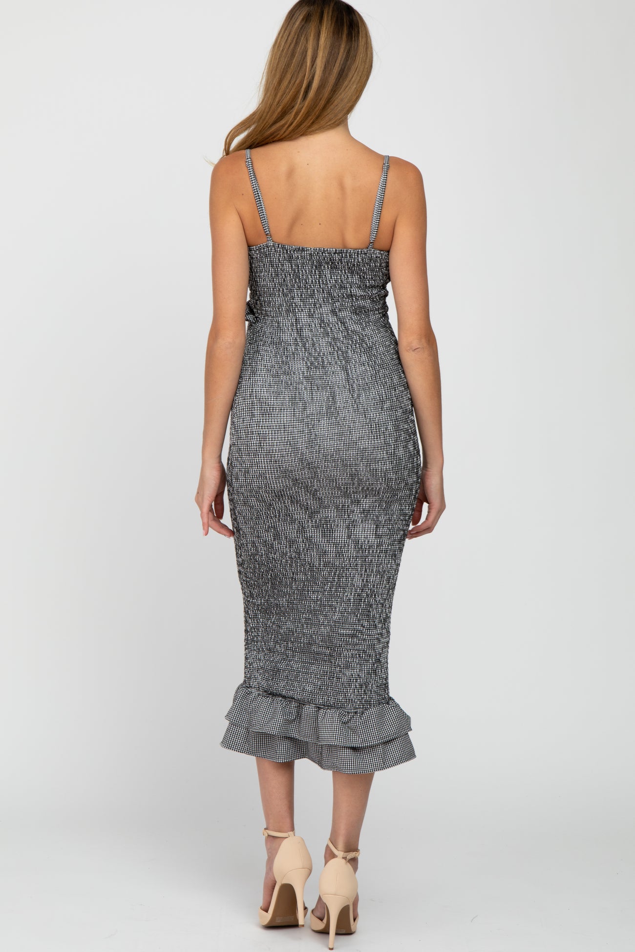 Black Gingham Print Smocked Fitted Self-Tie Maternity Midi Dress