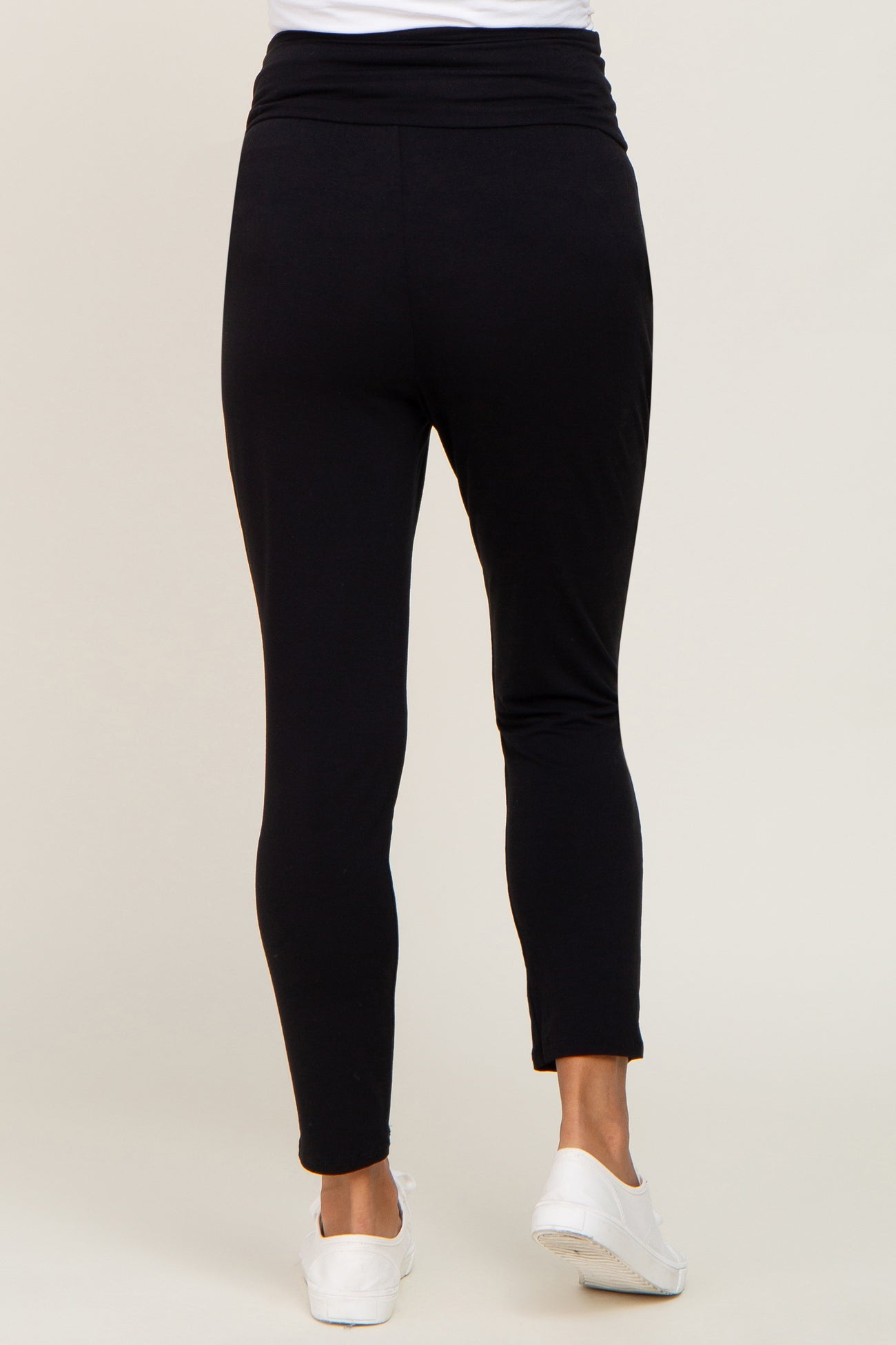 A pair of solid maternity knit pants with a high waist fit, a wide waistband, and side pockets.