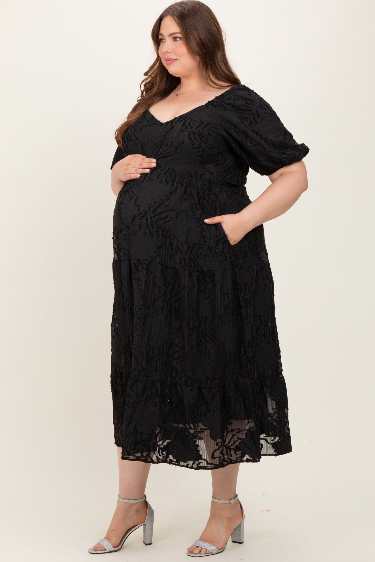 Black Leaf Textured Tiered Maternity Plus Midi Dress
