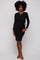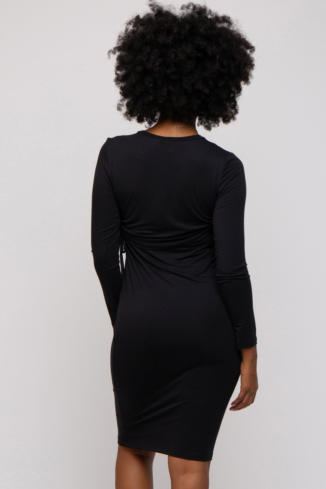 A solid hued nursing dress featuring long sleeves, a self-tie adjustable top and a rounded neckline.