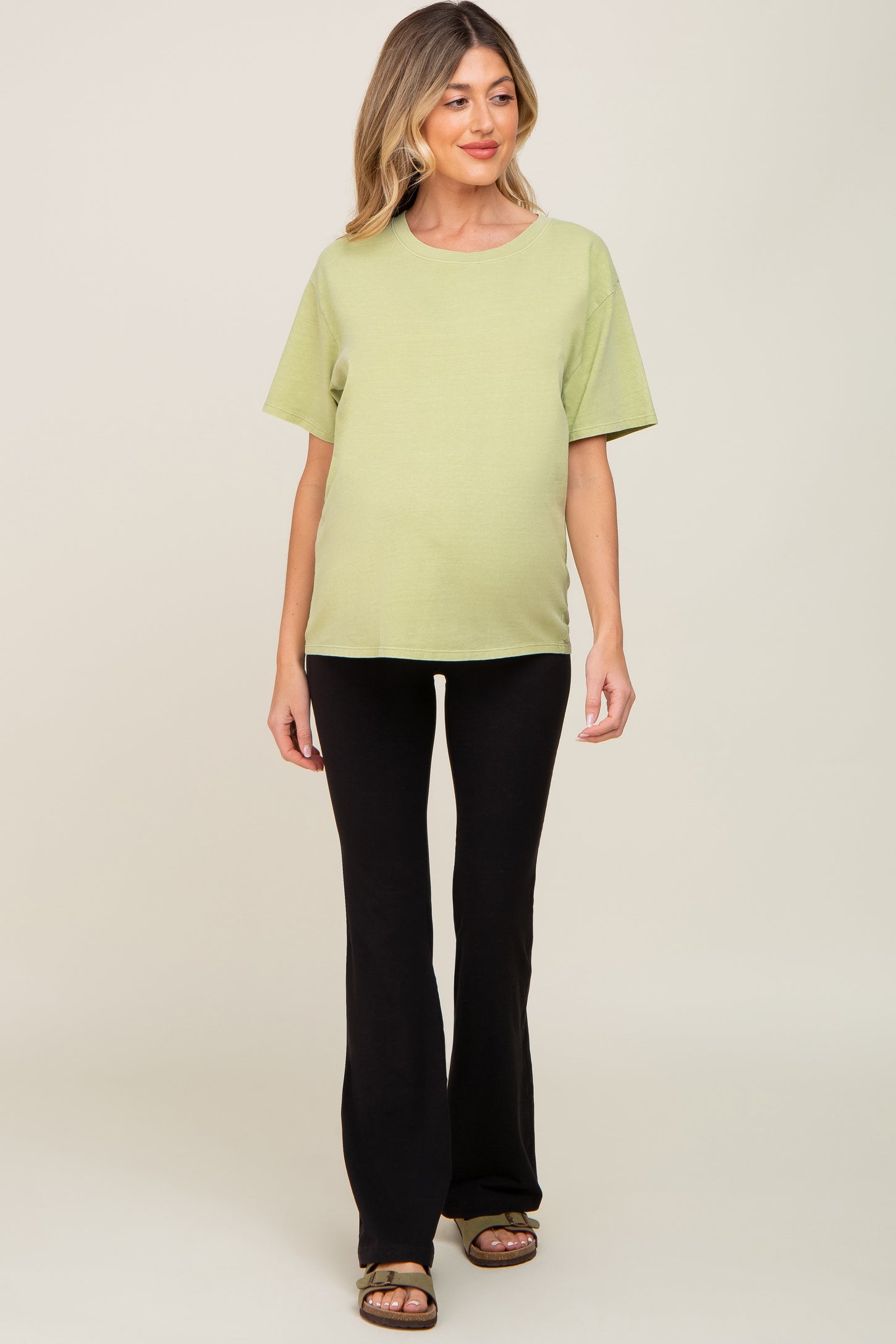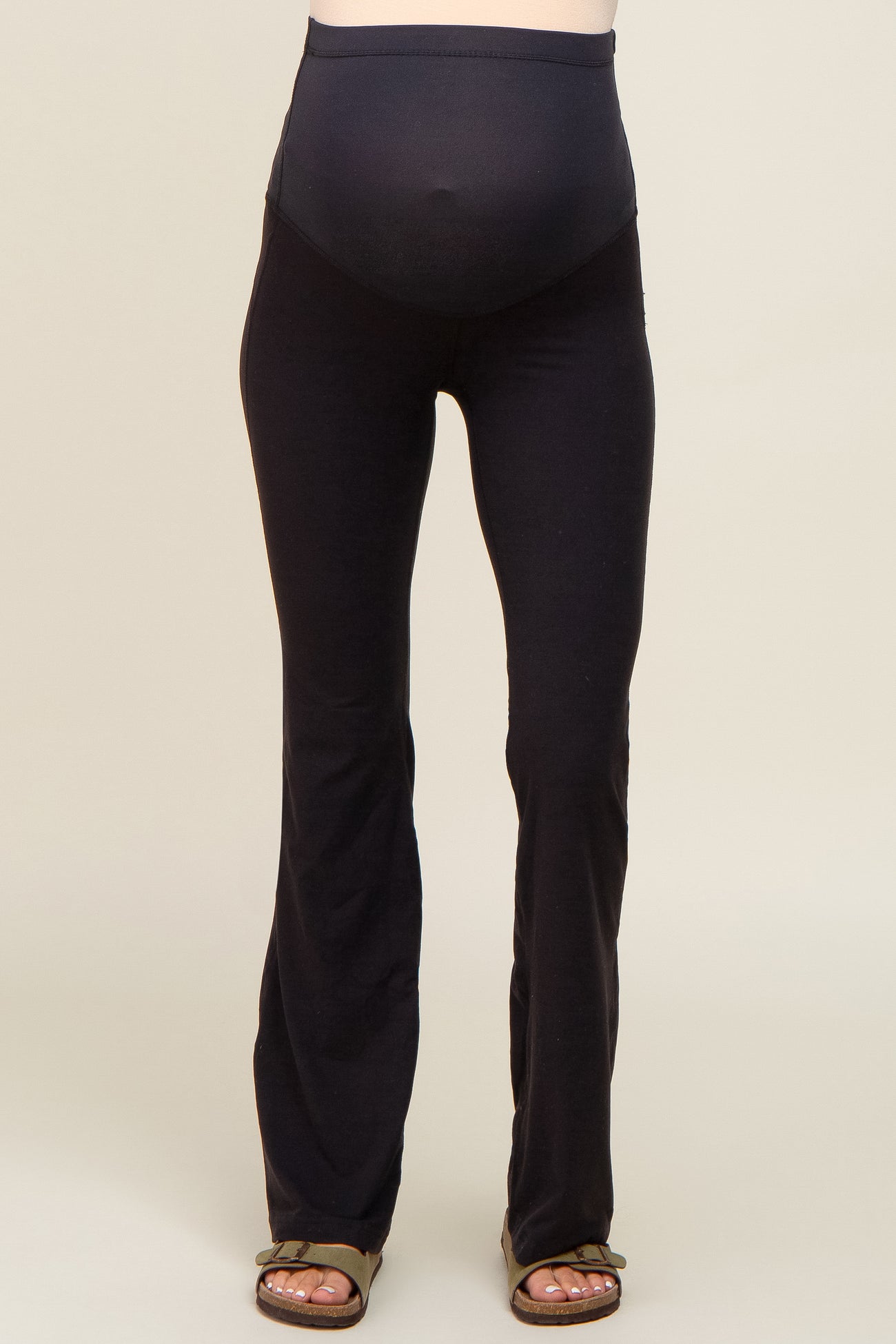 A pair of solid maternity leggings with a flare leg. Includes full pane elastic belly band. Material has high stretch.