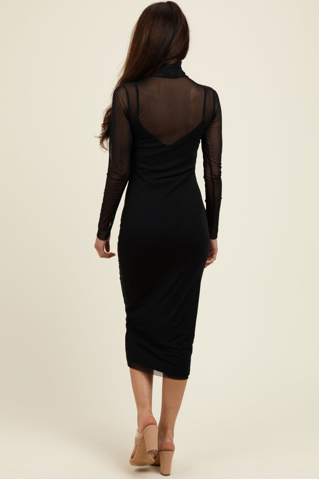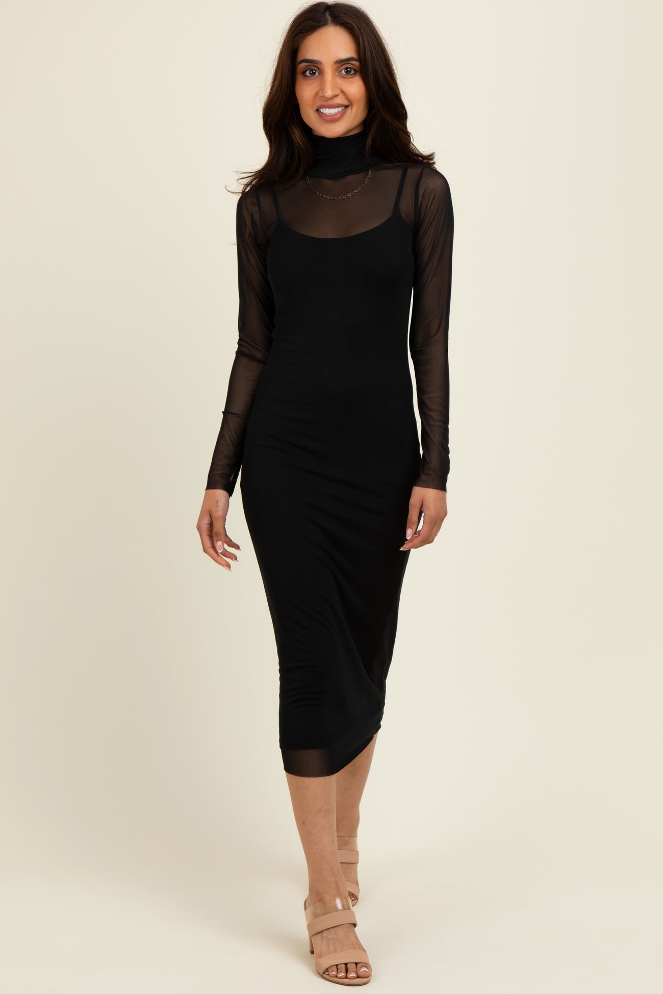 Elevate your evening look with this Black Mesh Overlay Fitted Midi Dress. Featuring a sleek black slip dress layered under a sheer mesh turtleneck with long sleeves, this stunning piece effortlessly combines elegance and modern edge. The midi length flatters every silhouette, while the figure-hugging fit enhances your curves for a sophisticated yet sultry vibe. Perfect for cocktail parties, date nights, or special occasions, this dress pairs beautifully with your favorite heels and accessories. Step out with confidence and make a lasting impression in this must-have statement piece. Available in multiple sizes.