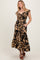 Step out in effortless style with our Black Mocha Smocked Top Midi Dress. Featuring a flattering smocked bodice and adjustable drawstring front, this dress hugs your curves with a comfortable fit. The bold black floral print on a warm mocha background adds a trendy, nature-inspired touch. With cap sleeves and a flowy midi skirt finished with a ruffled hem, it’s perfect for brunch dates, casual outings, or evening strolls. Crafted from lightweight, breathable fabric, it offers all-day comfort and chic appeal. Pockets add a practical detail you'll love. Pair with sandals or wedges for a versatile look that transitions from day to night.