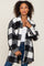 A long plaid shirt jacket featuring a soft brushed material, a collar, long sleeves, front functioning buttons, two front pockets, two side pockets, and a rounded hemline.