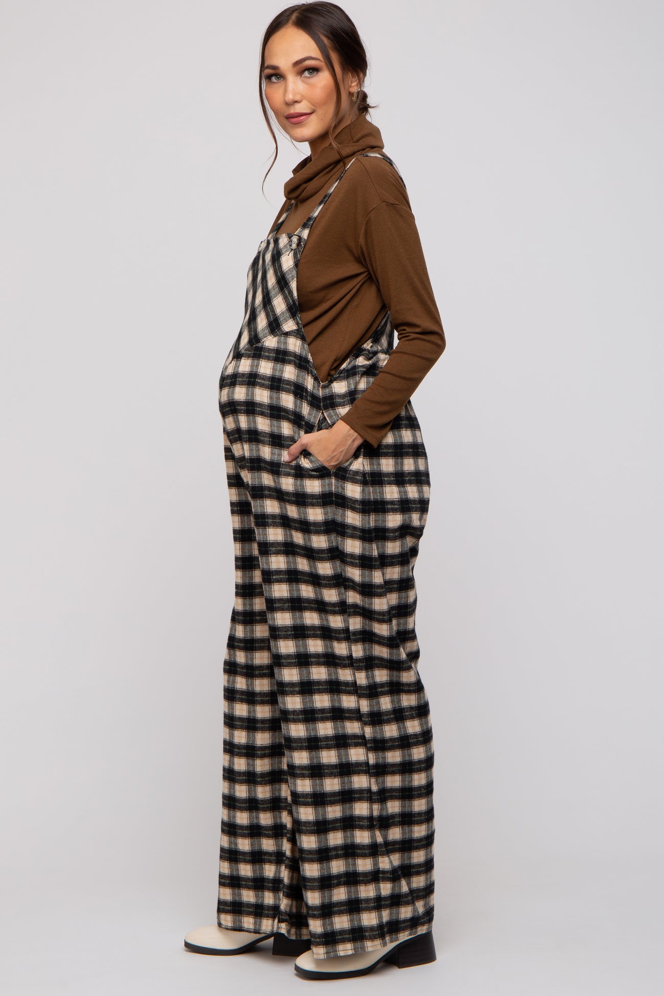 Black Plaid Button Front Wide Leg Maternity Overalls