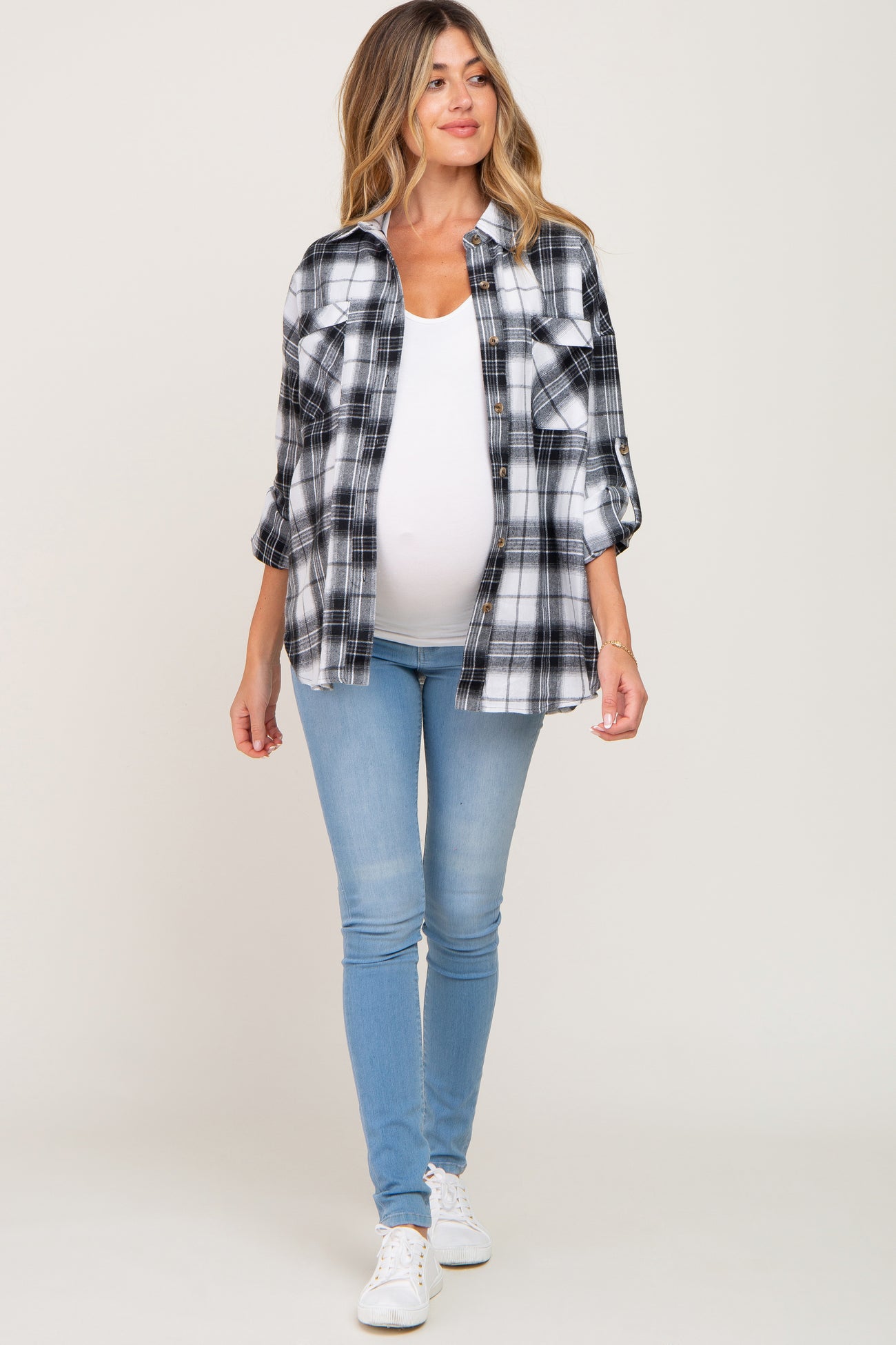 A plaid print maternity flannel top with collared neckline, button front closure and two front pockets. Additional button on mid sleeve for multiple wear.
