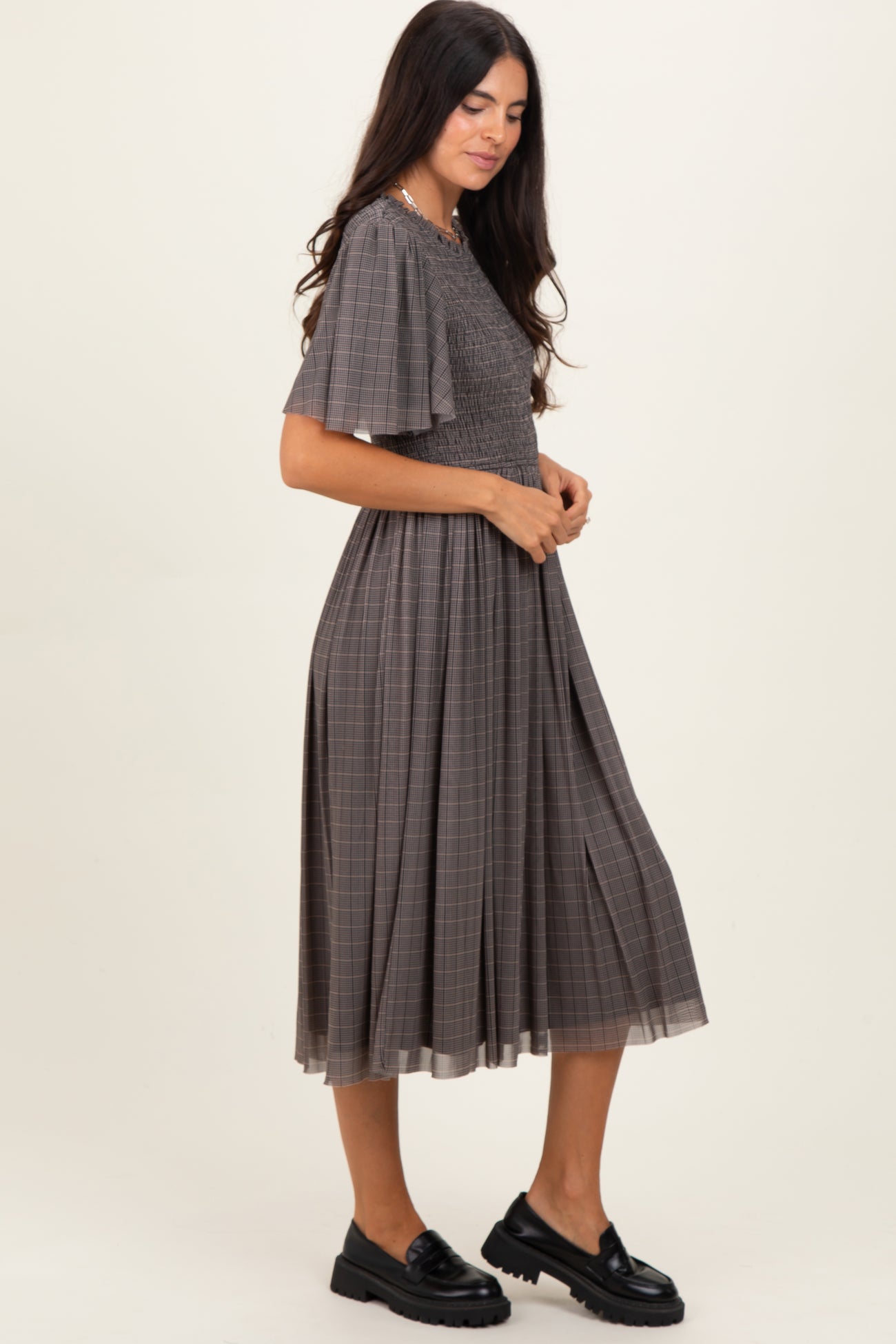 Step into effortless elegance with this Black Plaid Smocked Mesh Midi Dress. Featuring a classic black plaid pattern, this midi dress combines timeless style with modern comfort. The smocked bodice offers a flattering fit that hugs your silhouette, while delicate mesh fabric adds subtle texture and sophistication. Puff sleeves and a round neckline create a charming, vintage-inspired look. Perfect for work, brunch, or weekend outings, this dress pairs beautifully with boots or heels for versatile styling. Embrace chic, understated fashion with this must-have dress that seamlessly blends comfort and style.