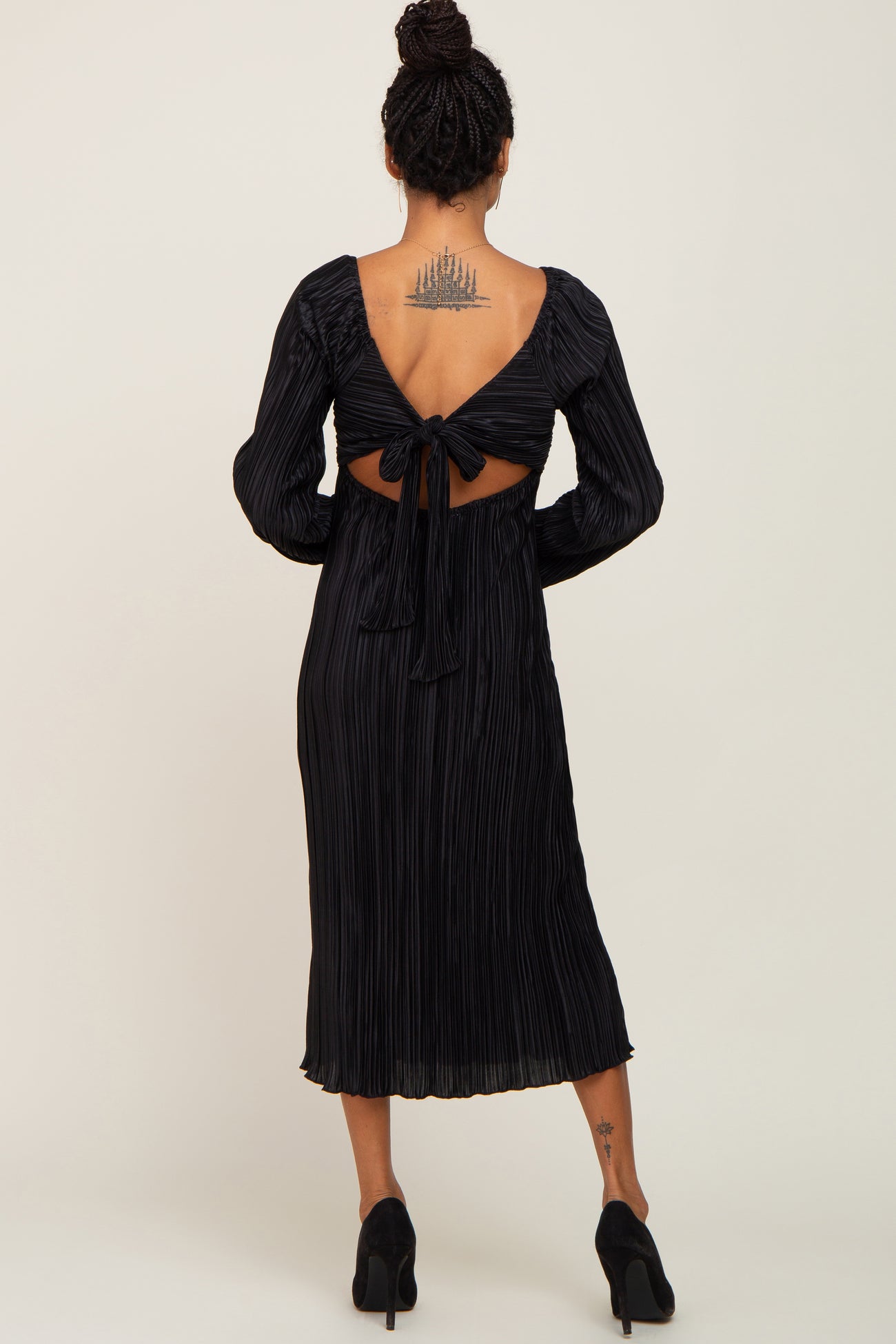 Details A pleated midi dress with a sweetheart knot top, a front cutout, long sleeves, a back cutout with a back tie, and a lettuce hem. Content + Care