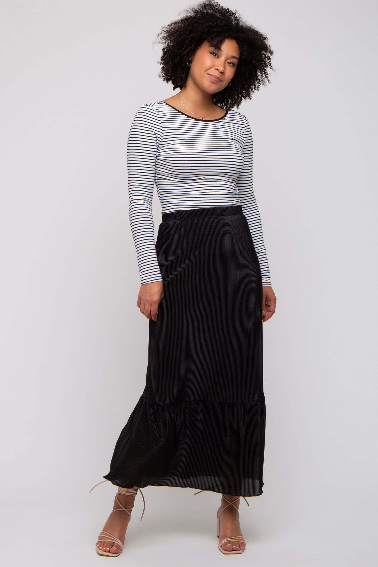 A solid pleated maxi skirt with an elastic waistband and ruffle hem.