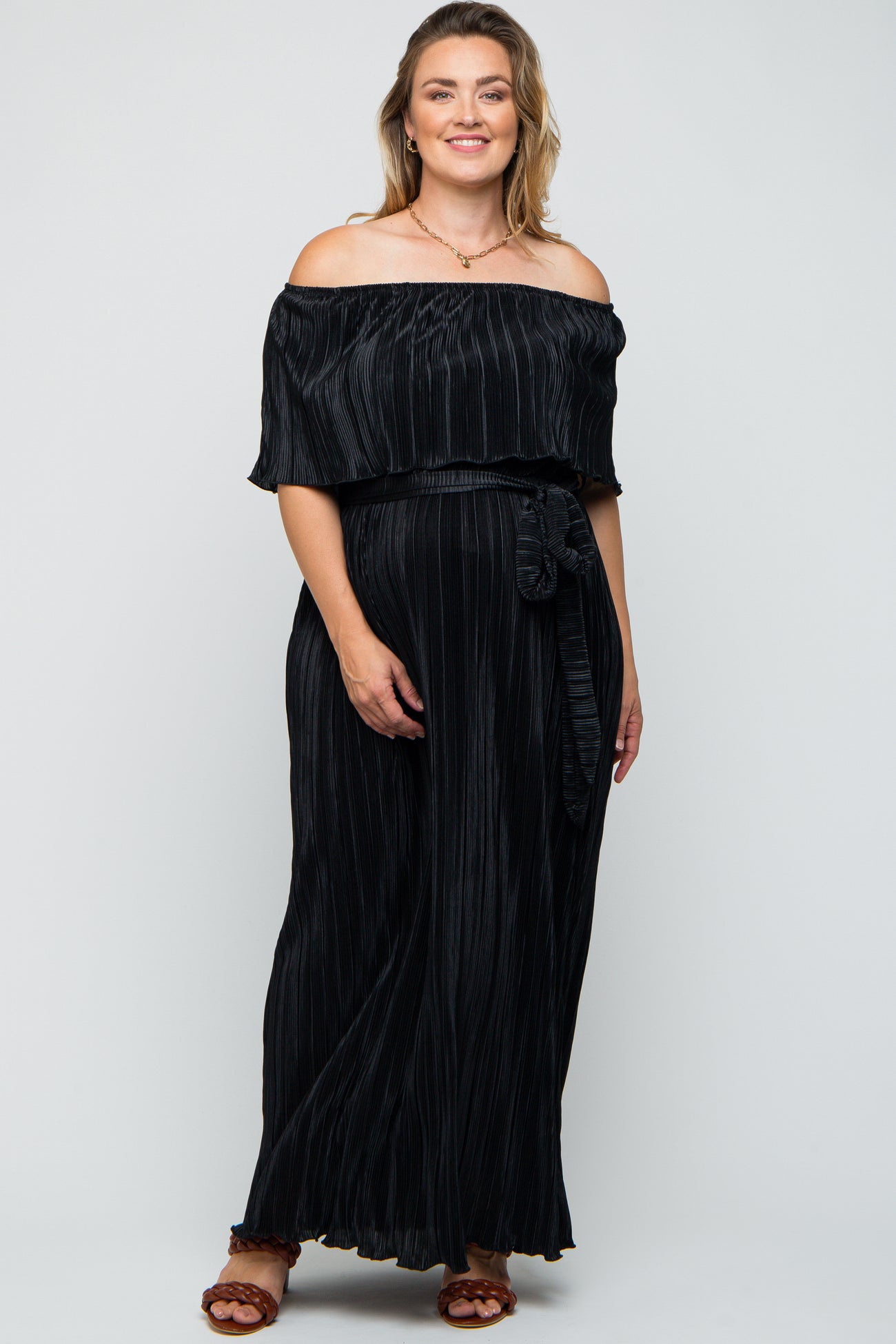 Black Plisse Off Shoulder Maternity Plus Maxi Dress