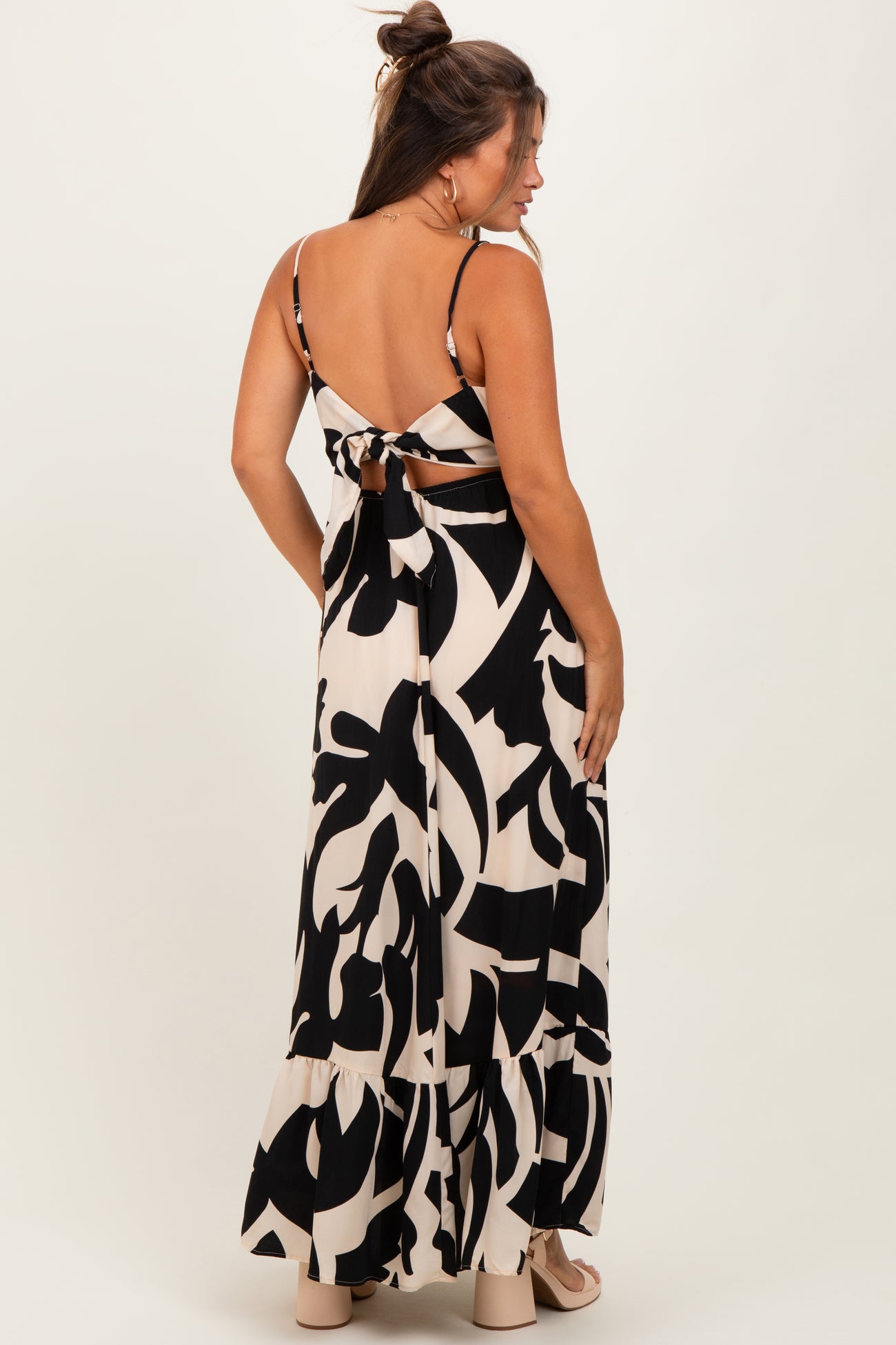 Stay stylish and comfortable throughout your pregnancy with our Black Printed Sleeveless Cutout Tie Back Maternity Maxi Dress. Featuring a chic black and cream abstract print, this dress offers a flattering square neckline and adjustable spaghetti straps for a perfect fit. The cutout detail on the sides combined with a tie-back closure adds a trendy touch while allowing room for your growing bump. Made from lightweight, breathable fabric, it flows effortlessly to the ankle, making it ideal for casual outings, baby showers, or special events. Elevate your maternity wardrobe with this versatile maxi dress designed for both comfort and style.
