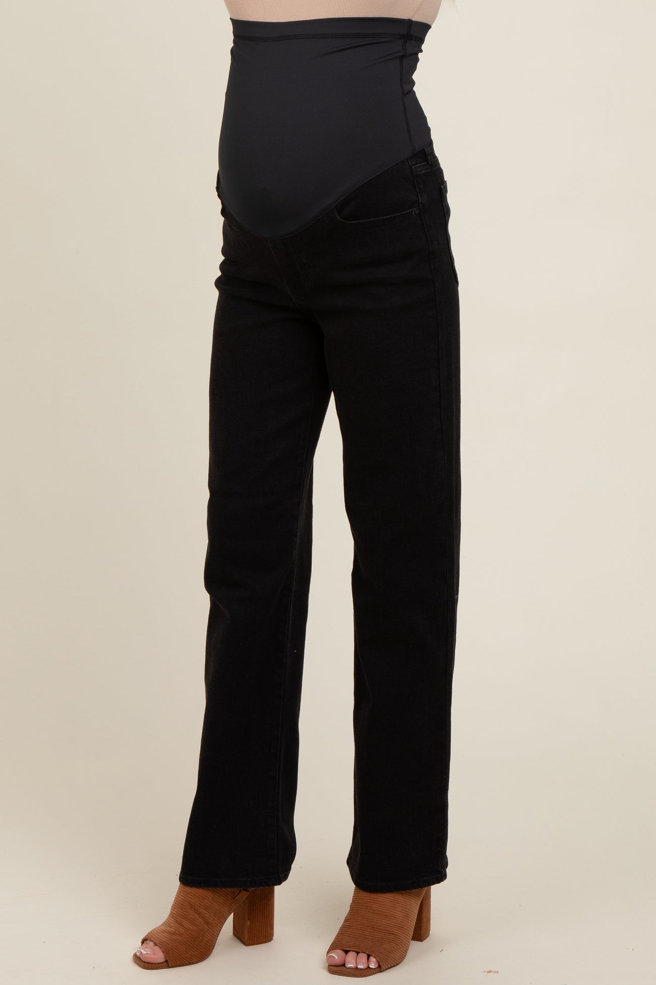A dark wash pair of maternity jeans with five pockets and full panel elastic bellyband. Material as little stretch.