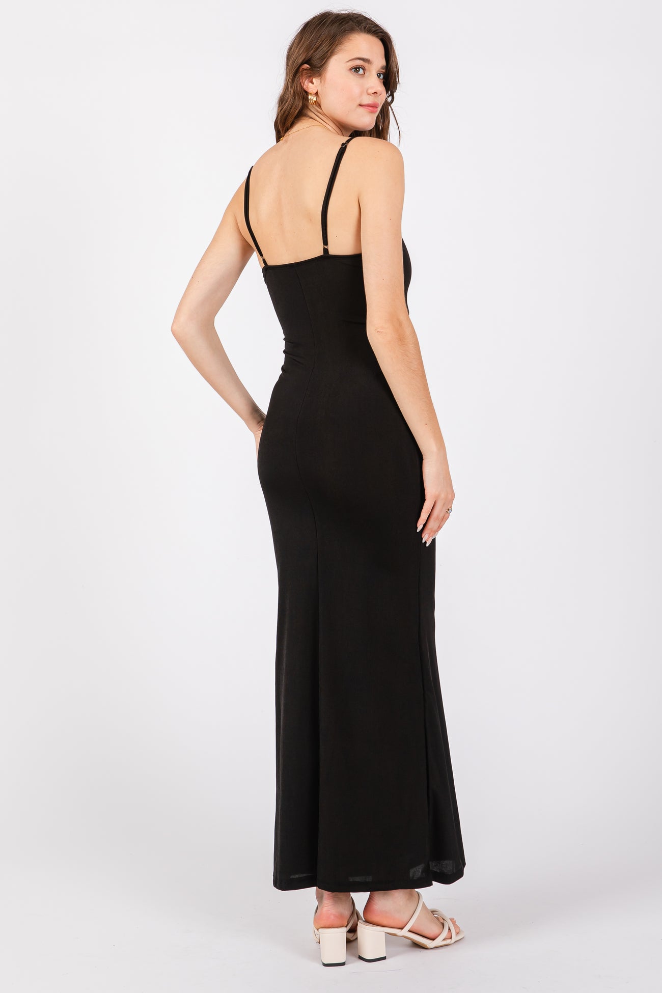 A solid ribbed maxi dress with adjustable straps. Double lined.