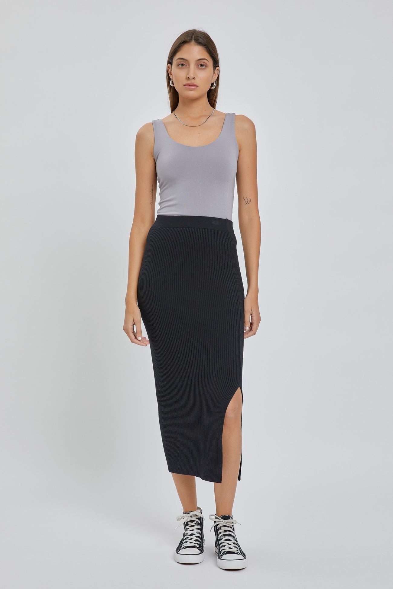Black Ribbed Fitted Side Slit Maternity Midi Skirt