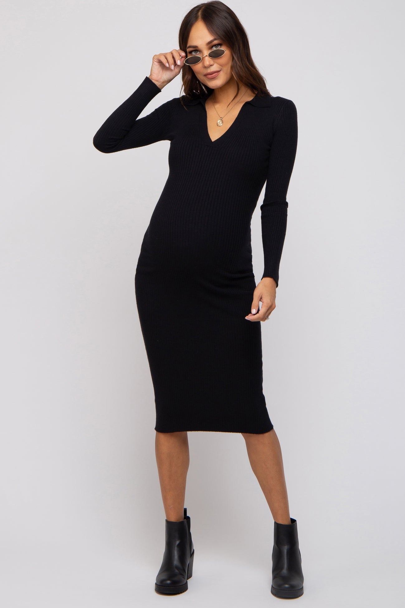 A solid ribbed knit fitted maternity dress with a collared v-neckline.