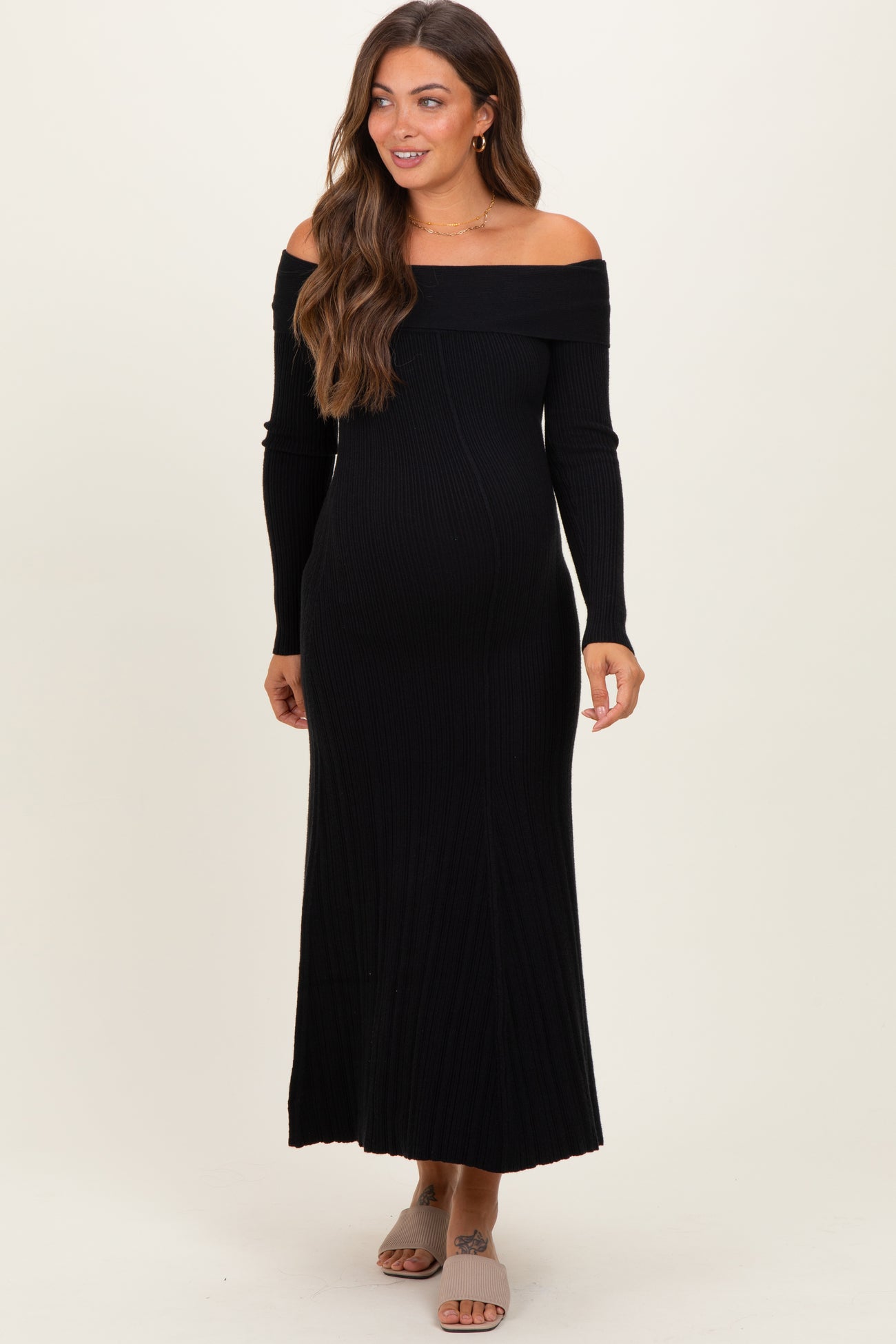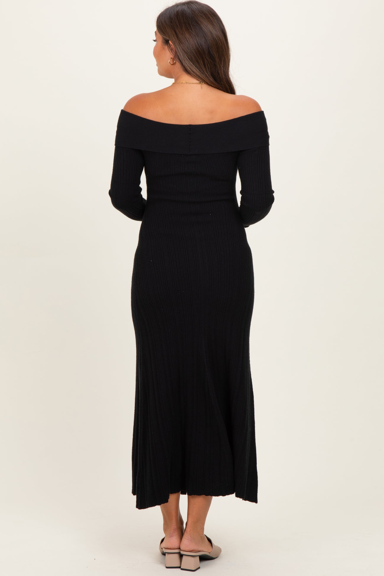 Black Ribbed Knit Off Shoulder Maternity Midi Dress