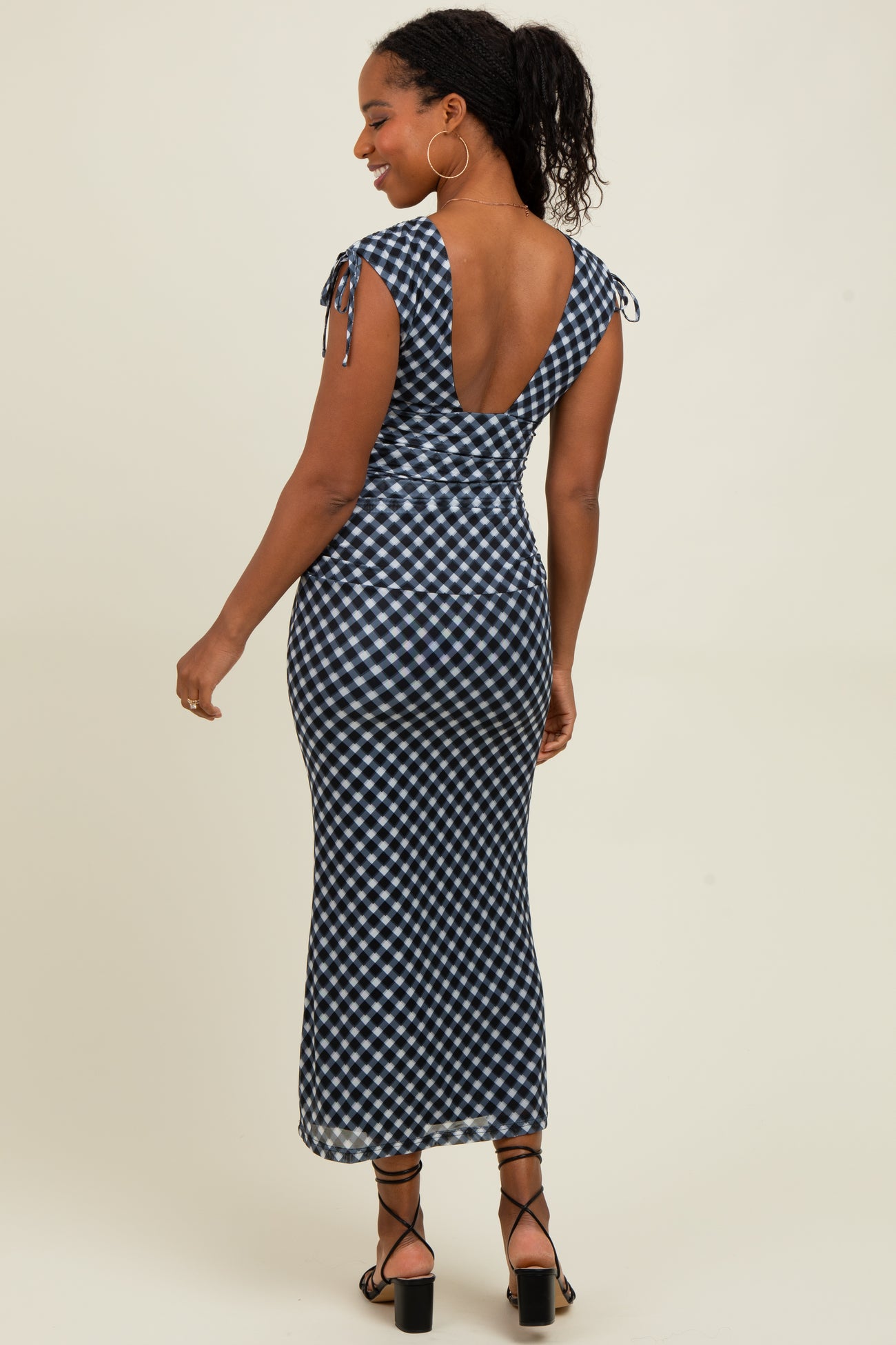Black Ruched Gingham Shoulder Tie Maxi Dress