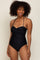 A solid one piece swimsuit featuring a halter strap, a ruched body and a padded bust.