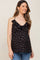 A floral print maternity tank top with a ruffle accent v-neckline, crisscross back, and adjustable straps.
