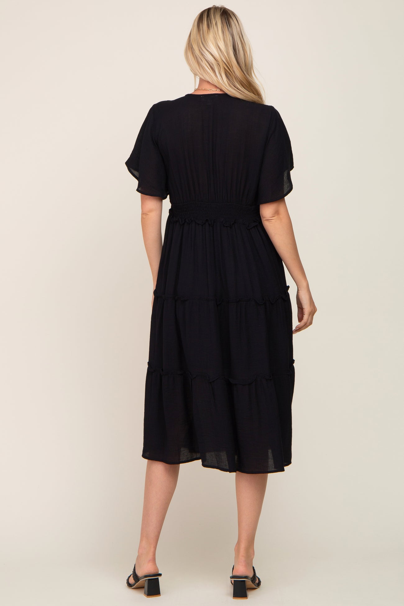 A midi dress with a v-neckline, short flounce sleeves, smocked back waistband, and ruffle accent tiered skirt. Front of the top and skirt are lined.