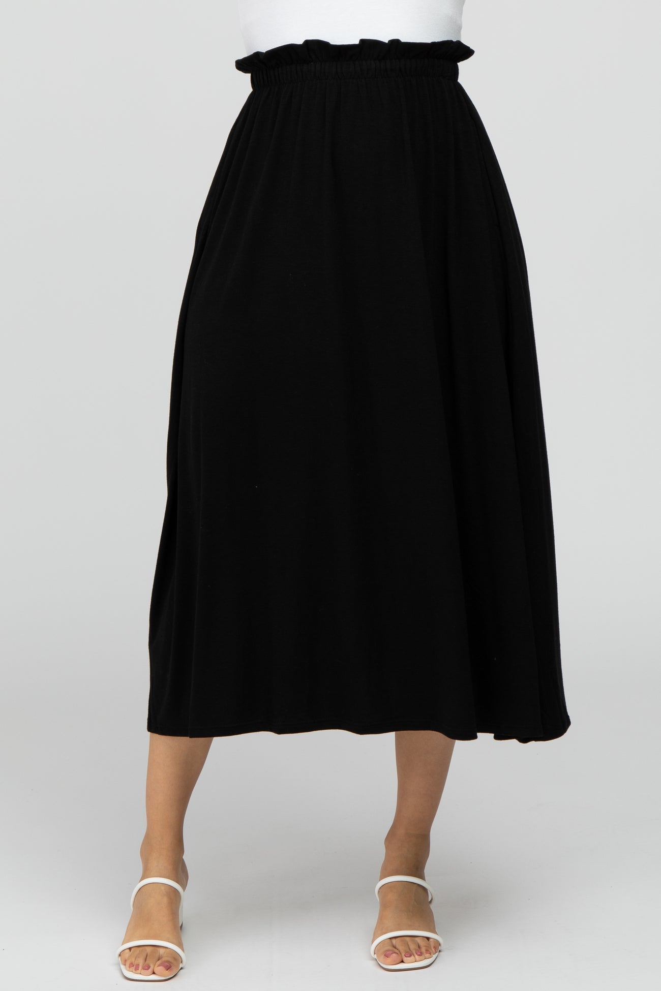 A solid midi skirt featuring an elastic ruffle waist band and side pockets.
