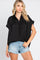 A satin top featuring a button front, a collared neckline and short dolman sleeves.