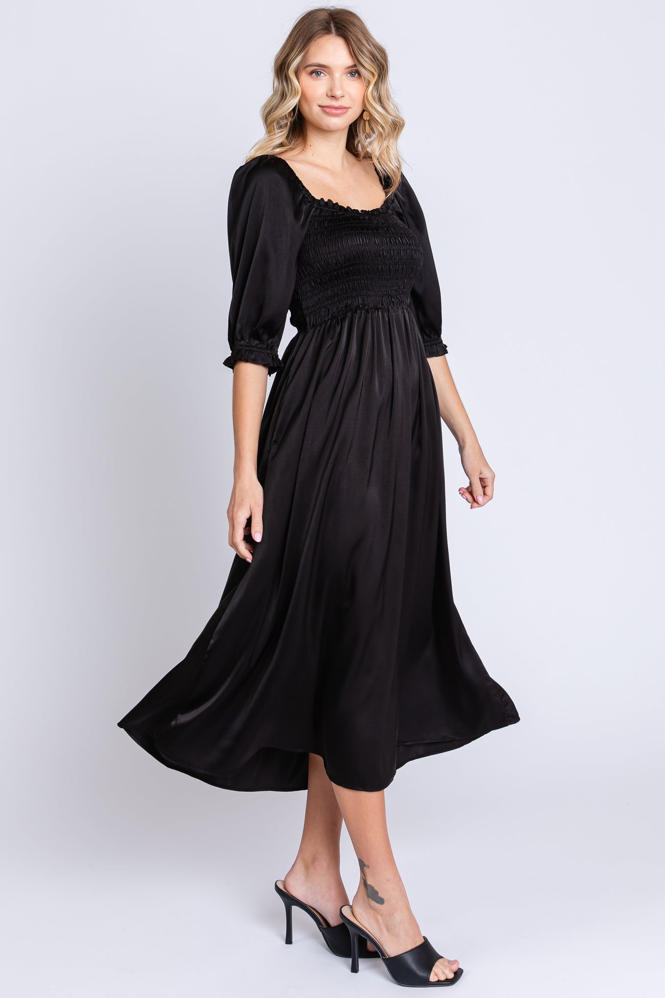 A solid satin midi dress with a smocked square ruffle accent bust, puff sleeves and side pockets.