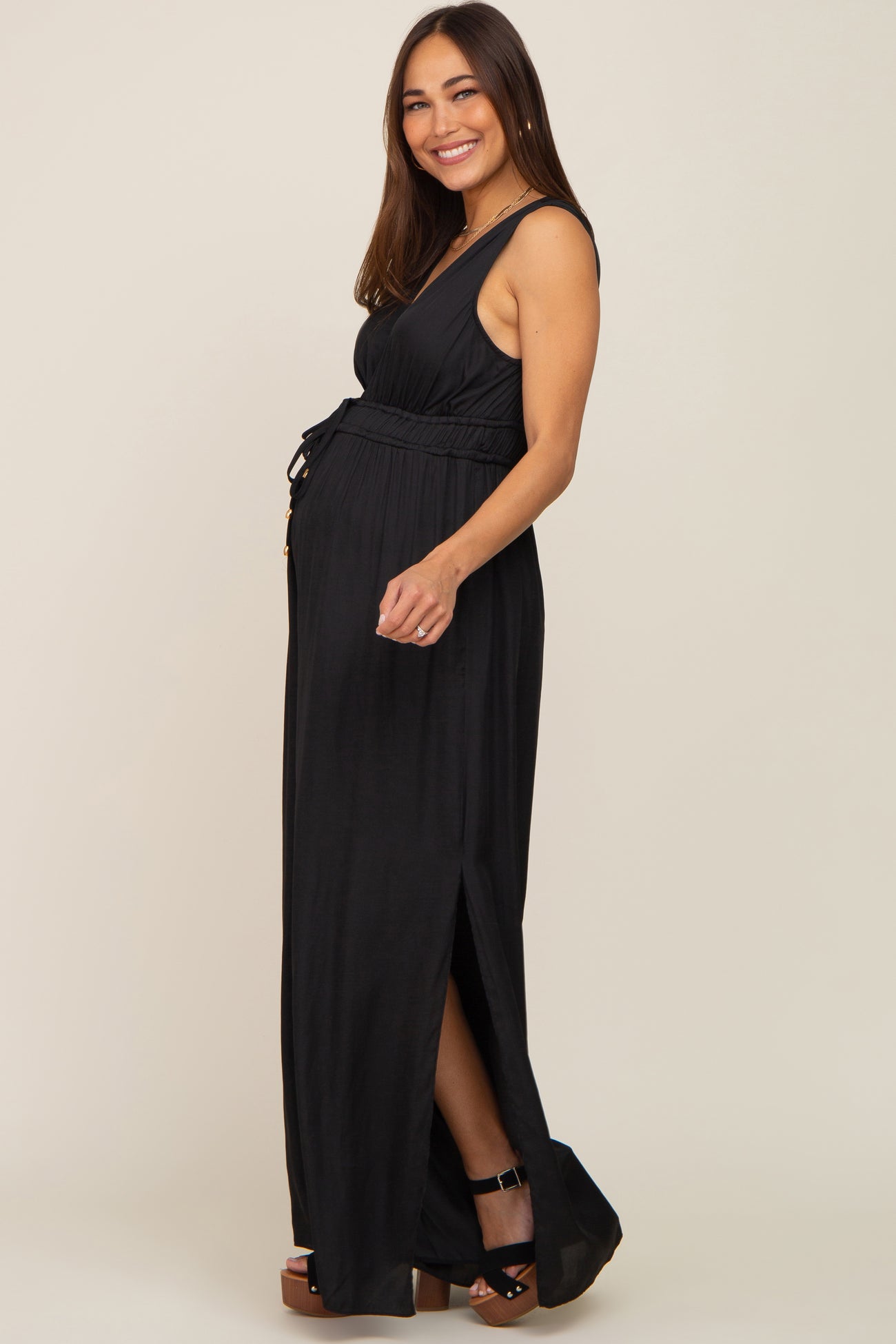 Black Satin V-Neck Side Slit Maternity Jumpsuit