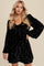 A sequin and velour dress featuring a front tie, long balloon sleeves, an open back with a back tie, and a back zipper closure. Dress is fully lined.