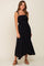 A solid midi dress featuring a shirred gathered top, adjustable shoulder ties, a ruffle accent along the waist, and side pockets. Dress is lined.