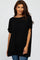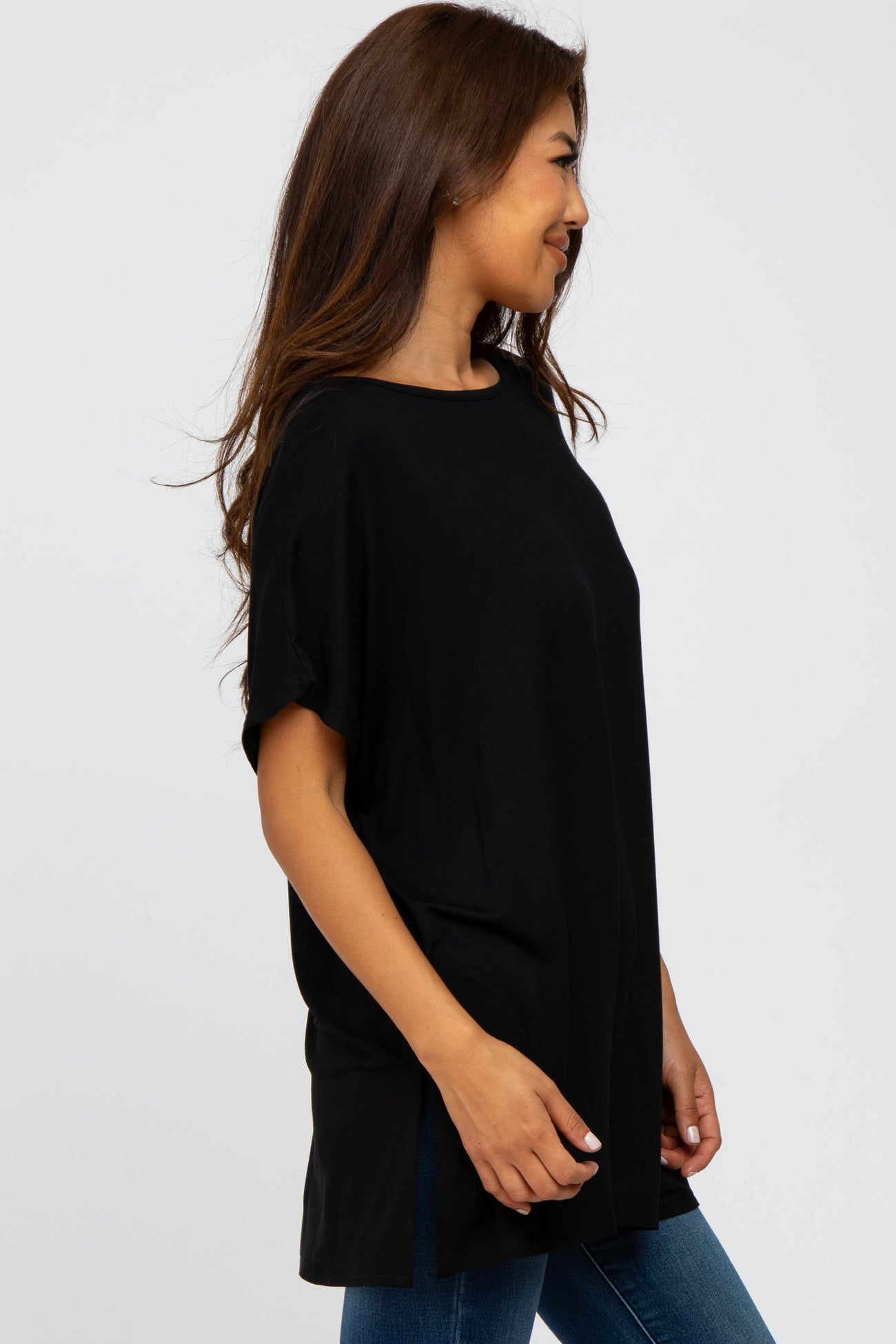 A solid top with a boatneck, short dolman sleeves, and side slits at the hemline.