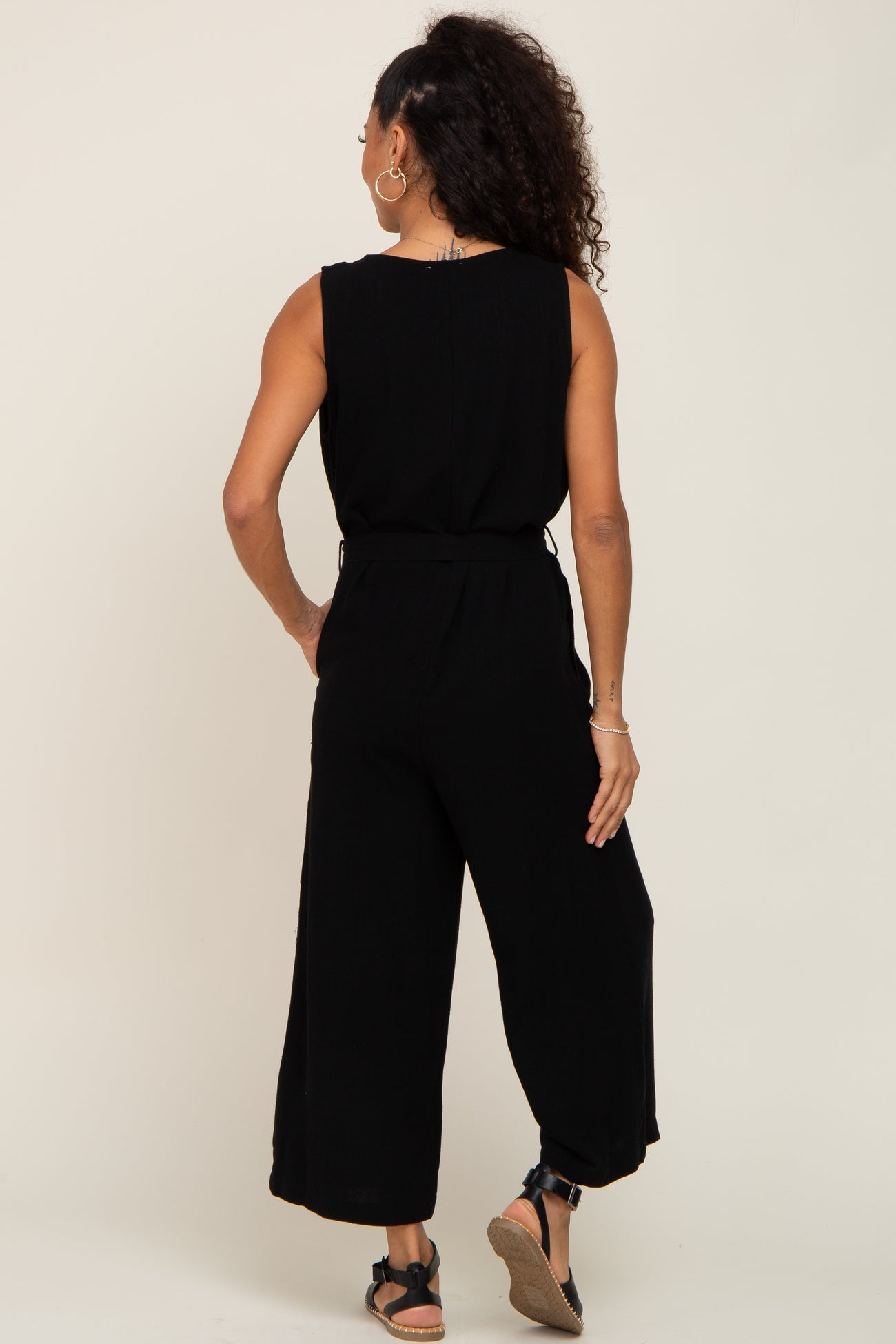 Black Sleeveless Button Front Cropped Jumpsuit