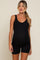 A sleeveless ribbed maternity bodysuit. Fitted. Rounded neckline.