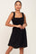 An eyelet dress featuring scrunch straps, a straight neckline, a smocked top, and full lining.