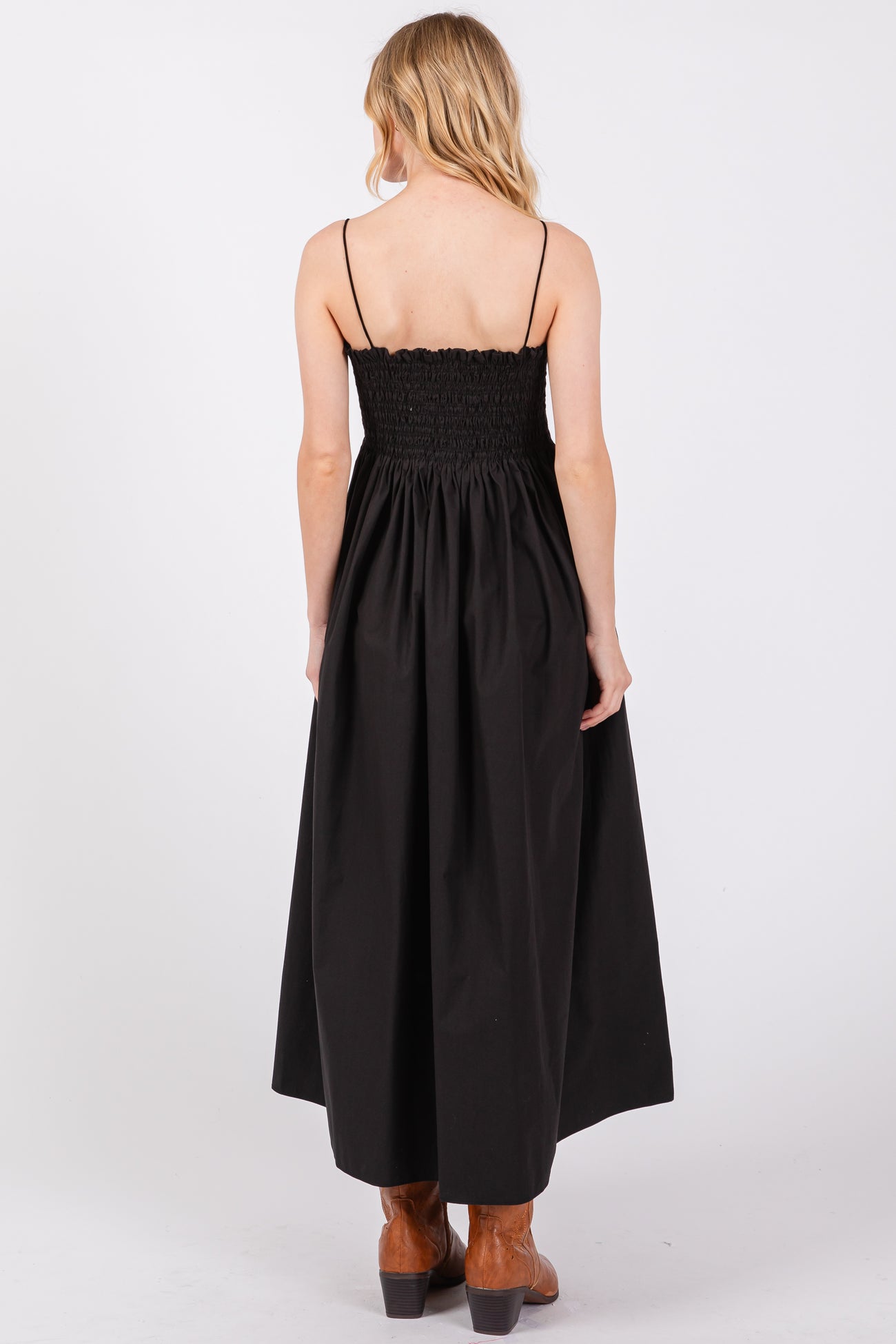 Black Smocked Pocketed Midi Dress
