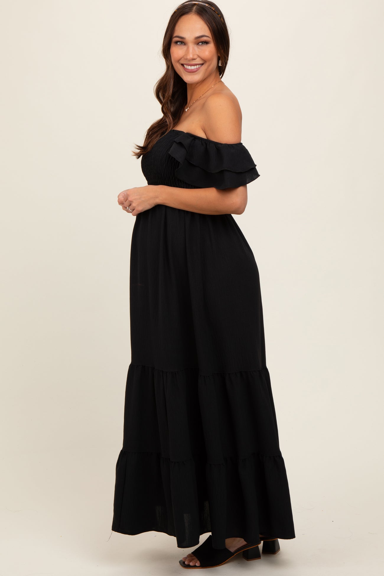 Black Smocked Ruffle Off Shoulder Tiered Maternity Maxi Dress