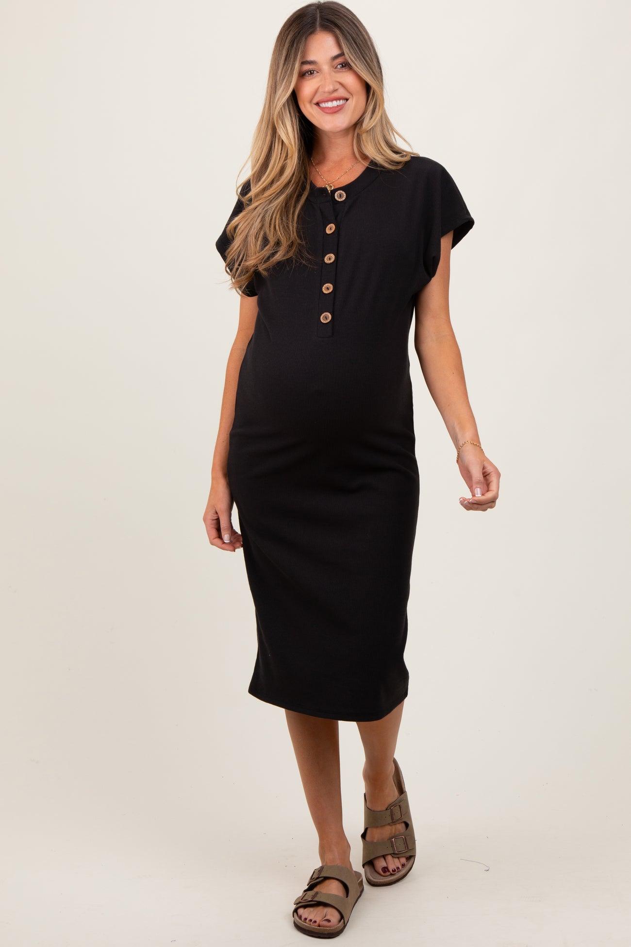 Black Solid Ribbed Short Sleeve Button Down Knit Maternity Midi Dress