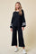 A striped set featuring long sleeves and long pants with a self-tie drawstring.