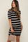A striped, rib knit maternity dress featuring a collar, top functioning buttons, and short sleeves.